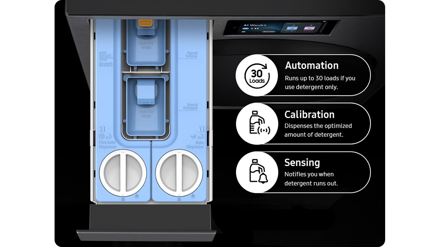 1Based on an AI-created algorithm and internal testing using the AI Wash+ cycle on a 3kg load. A turbidity sensor operates for all weights, while fabric sensing operates for 3kg and under. Actual results may vary depending on individual use.