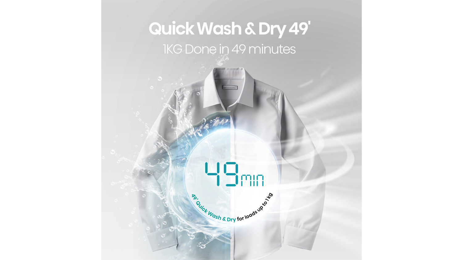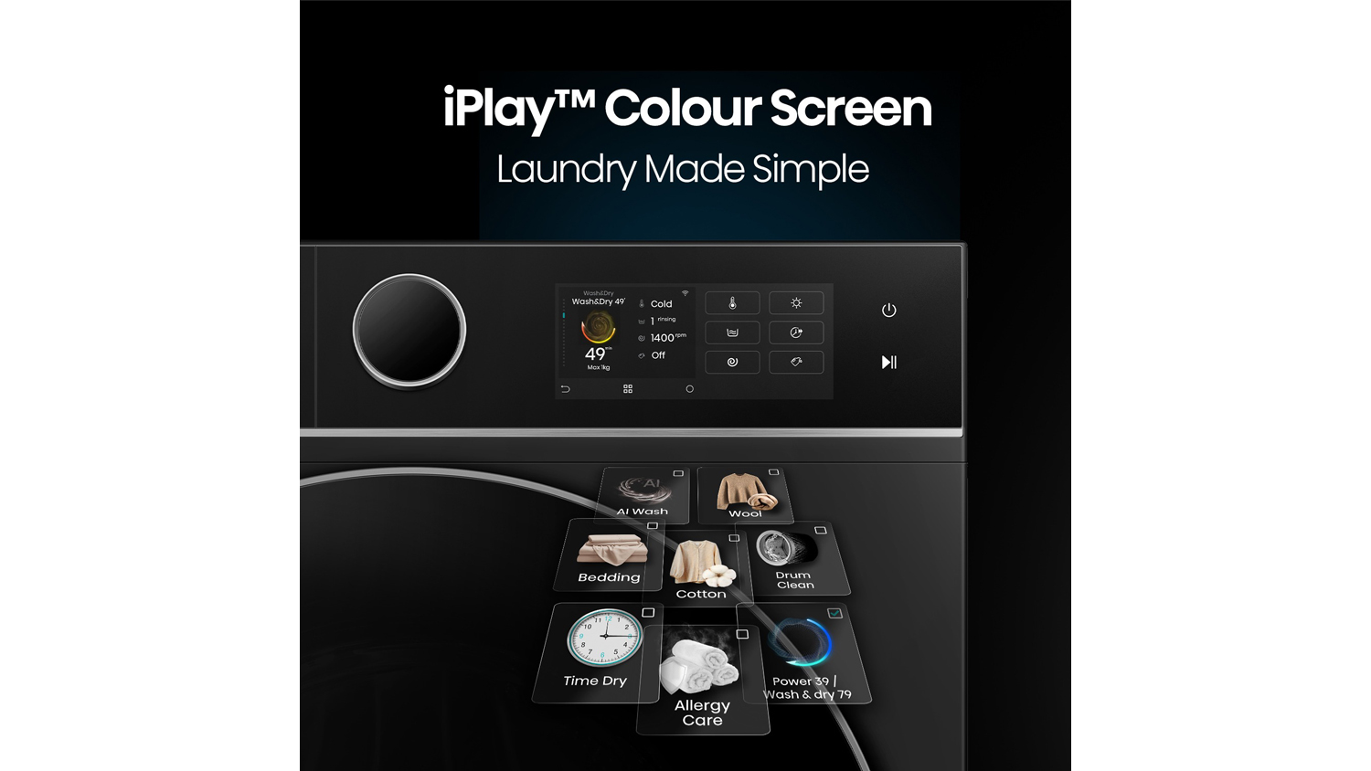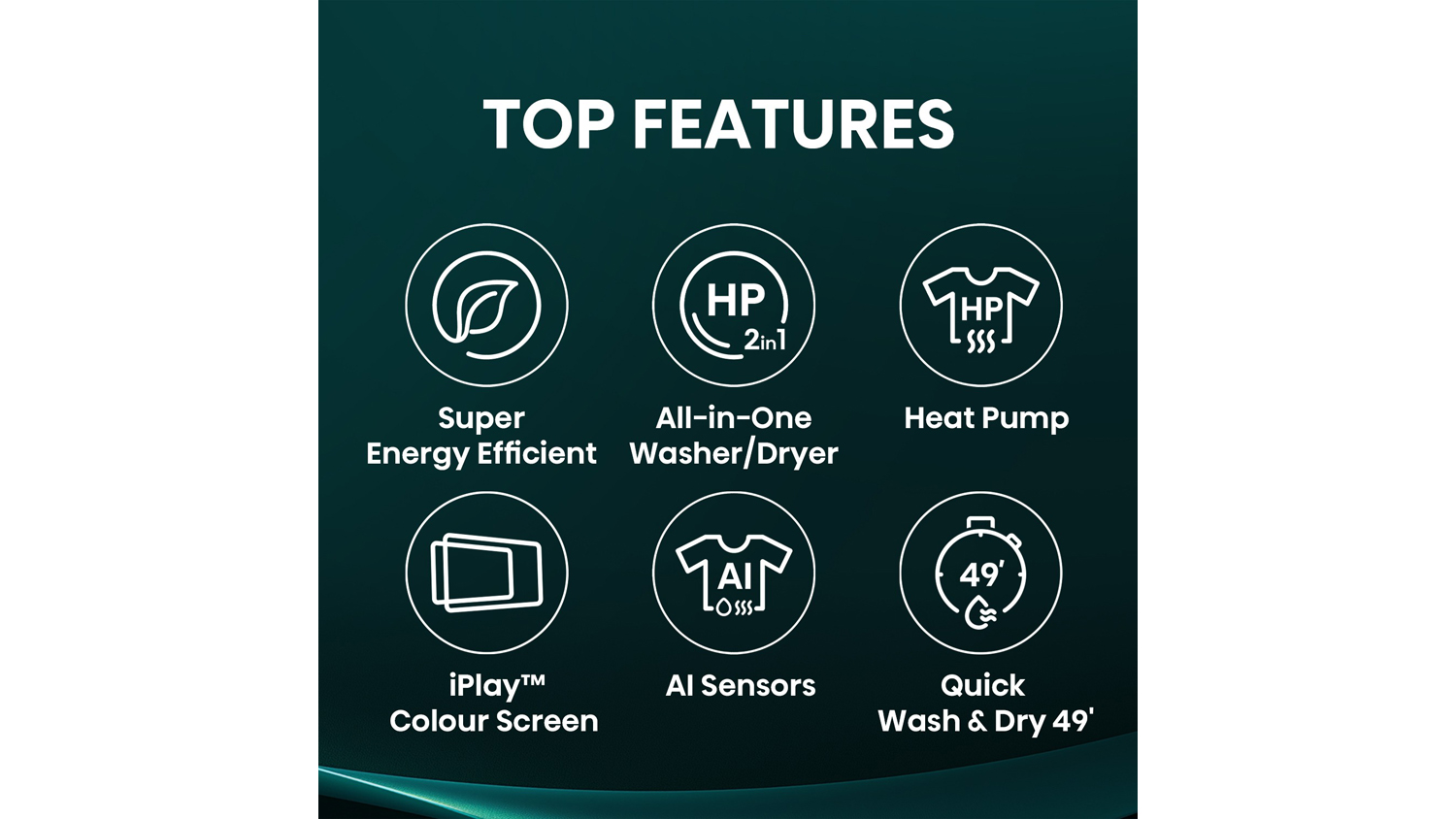| Wash Programs | Cotton, AI Super Wash, Quick 15′, ECO, Synthetics, Refresh, Baby Care, Allergy Care, Pets, Power 39′, Bedding, Wool, Rinse + Spin, Drum, Clean, Spin, Delicates, Mixed, Down, Sports Wear, Shirts |