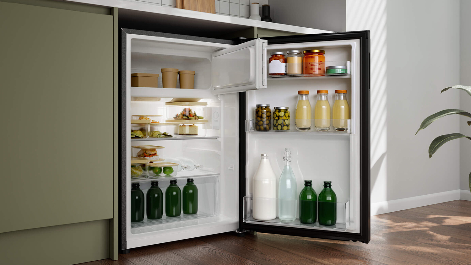 Small in size, big on convenience. The Haier 114L Bar Fridge Freezer provides a flexible food and beverage storage solution that fits seamlessly into any space, ensuring you're always ready to entertain. It also features numerous compartments suitable for fresh food, drinks, and even frozen essentials. Plus, this unit has a recessed handle, a reversible door, and adjustable feet for easy integration.