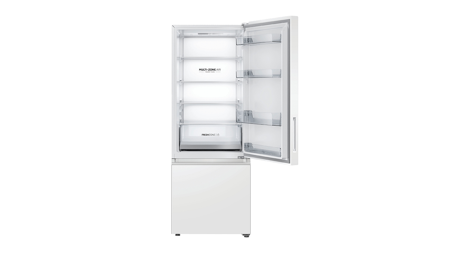 Store your everyday groceries in a safe, optimal environment using this Haier 500 Series 309L Bottom Mount Fridge Freezer. A great investment in your household, this appliance offers energy-efficient performance and multiple shelves to accommodate your different food items. It also employs Multi-Zone Air for uniform cooling inside the unit. Plus, it flaunts a modern design that snugly fits in common kitchen cavity heights.