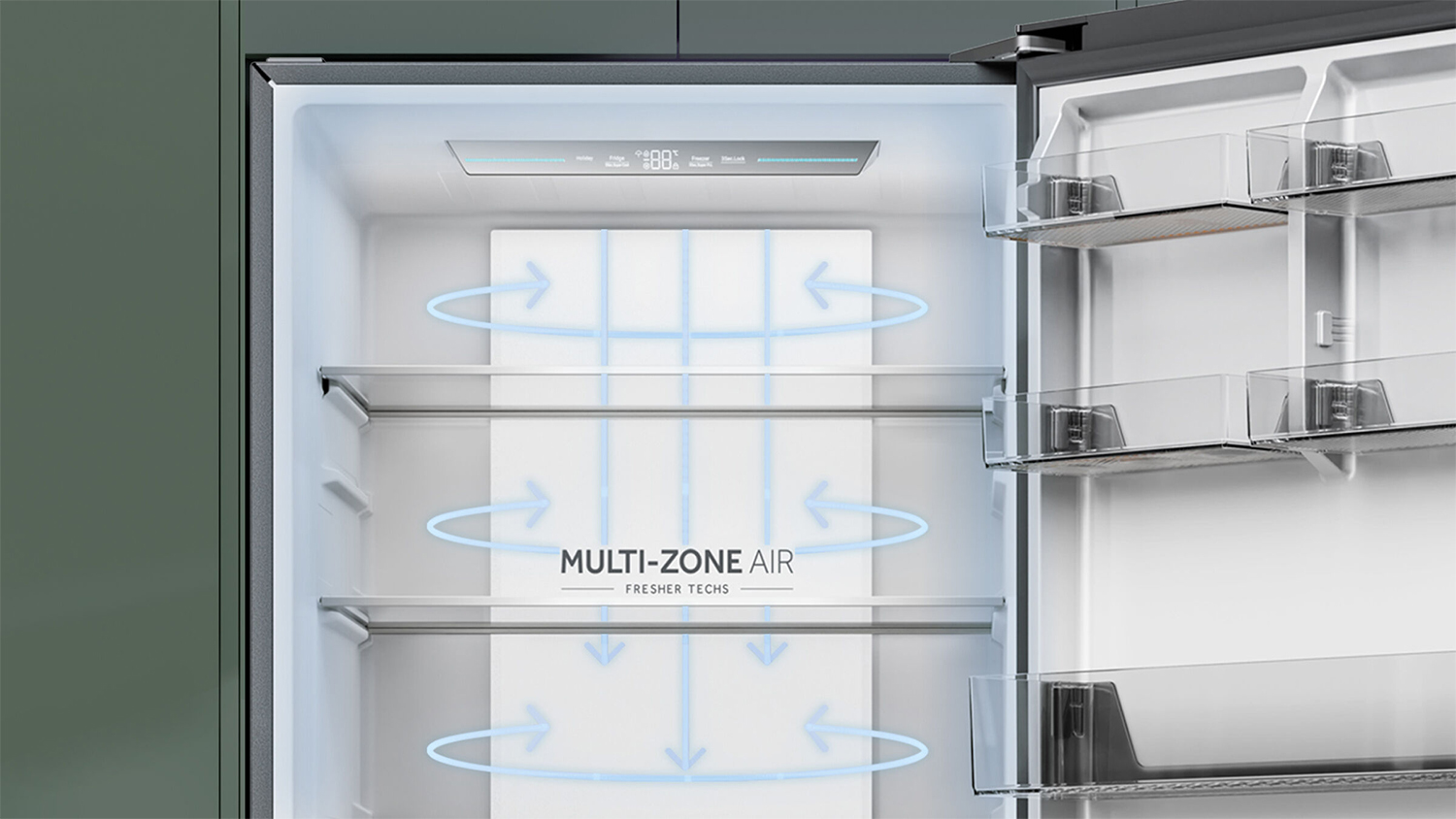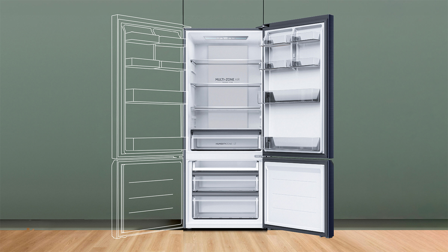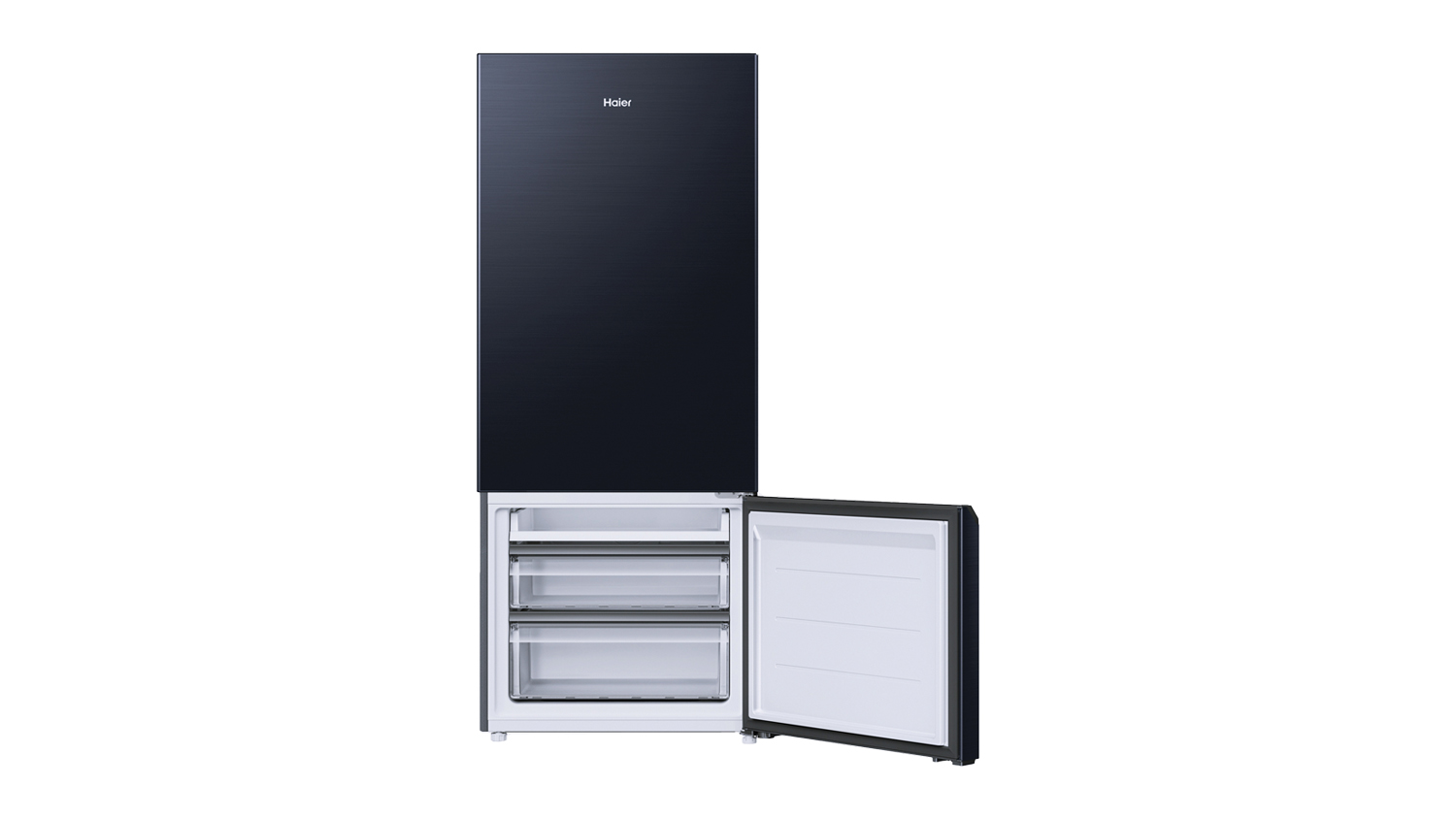Keep your groceries fresh and organised with the Haier 500 Series 433L Bottom Mount Fridge Freezer. Boasting a Multi-Zone Air cooling system, Super Freeze function, and frost-free technology, this appliance is a practical choice for any home. It also highlights a Humidity Zone fridge drawer, various door shelves and multiple freezer bins, giving you plenty of storage options for all your groceries. Moreover, its flat doors, reversible door configuration, recessed handle, and elegant black exterior effortlessly blend with any kitchen layout.