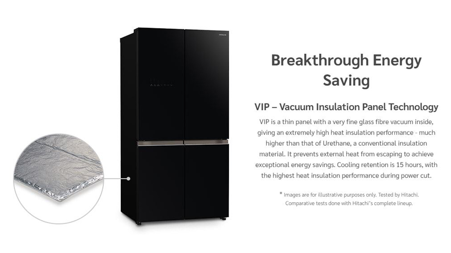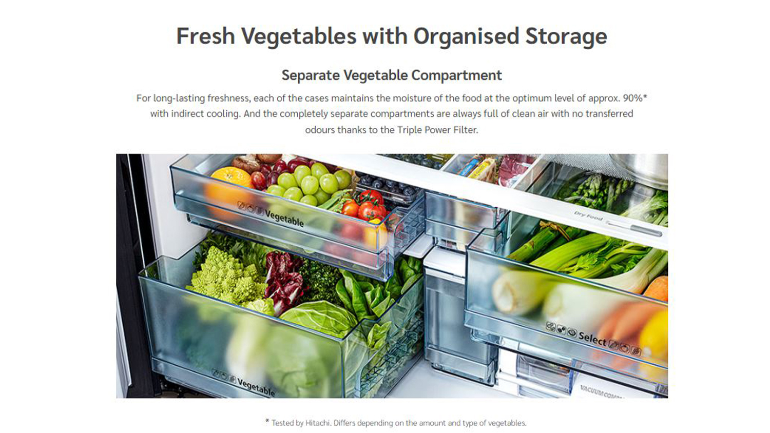 Combining smart innovation, functionality, and style, the Hitachi 638L Quad Door Fridge Freezer revolutionises food storage convenience. It is integrated with cutting-edge functions to preserve the quality of your food items longer, including a vacuum drawer, Inverter x Dual Fan Cooling, Selectable Zone freezer, dedicated produce compartments, and Triple Power Filter. It also comes with an internal refillable automatic ice maker to ensure you always have fresh ice at your fingertips.