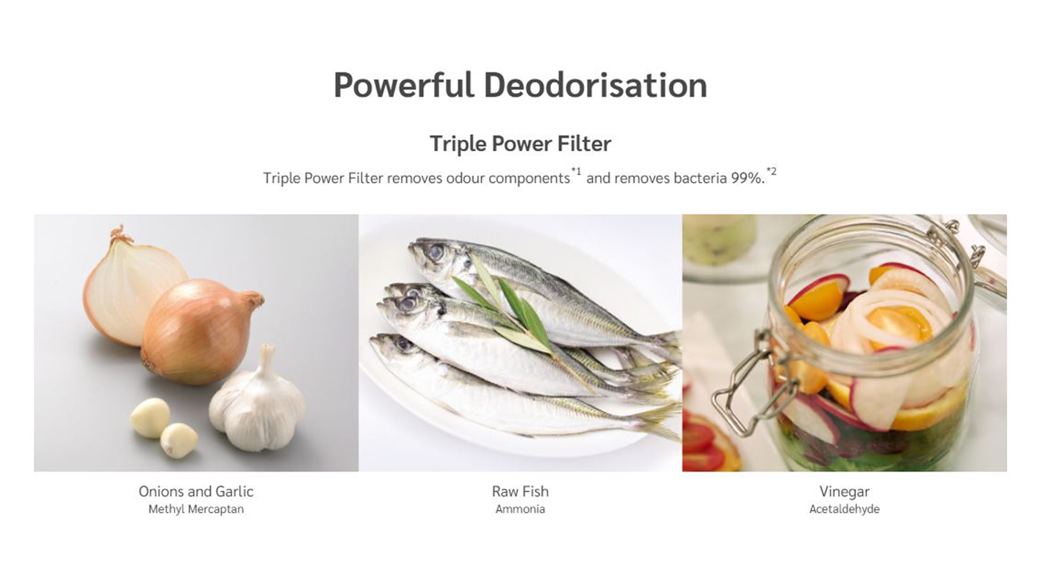 3 Triple Power Filter that catches and removes 7 odour components (Tested by Hitachi. The type of odours: Methyl Mercaptan, Ammonia, Acetaldehyde, Trimethylamine, Propanal, Hexanal and Acetic Acid).