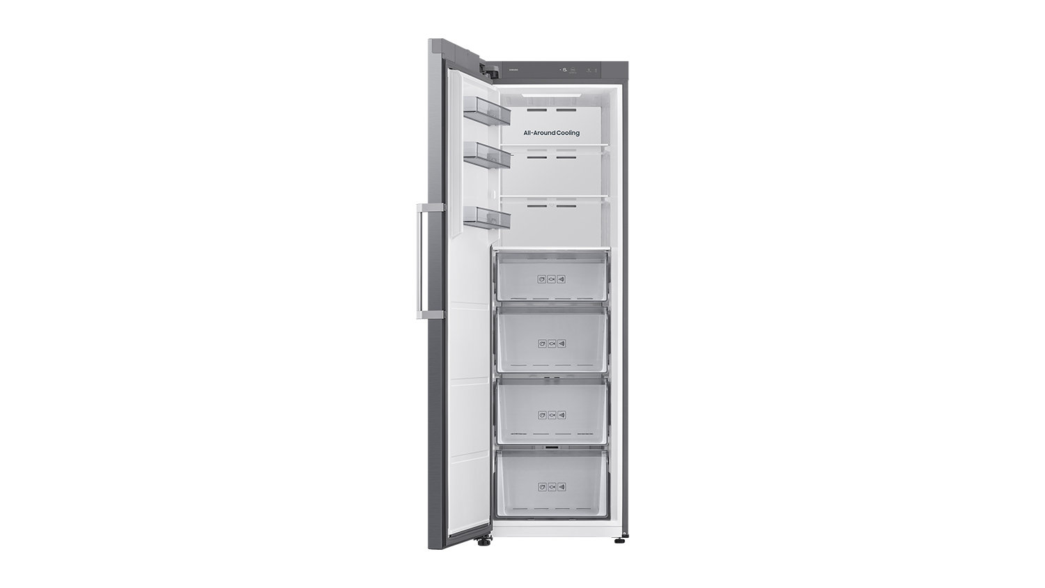 Effortlessly manage, preserve, and access your various frozen goods using the Samsung 323L Single Door Vertical Freezer. Perfect for your food storage needs, this unit employs an All Around Cooling System that delivers even temperatures across the unit. It also integrates a Digital Inverter Compressor Motor for efficient performance. Plus, it offers ample shelving options, so you can easily organise your items.
